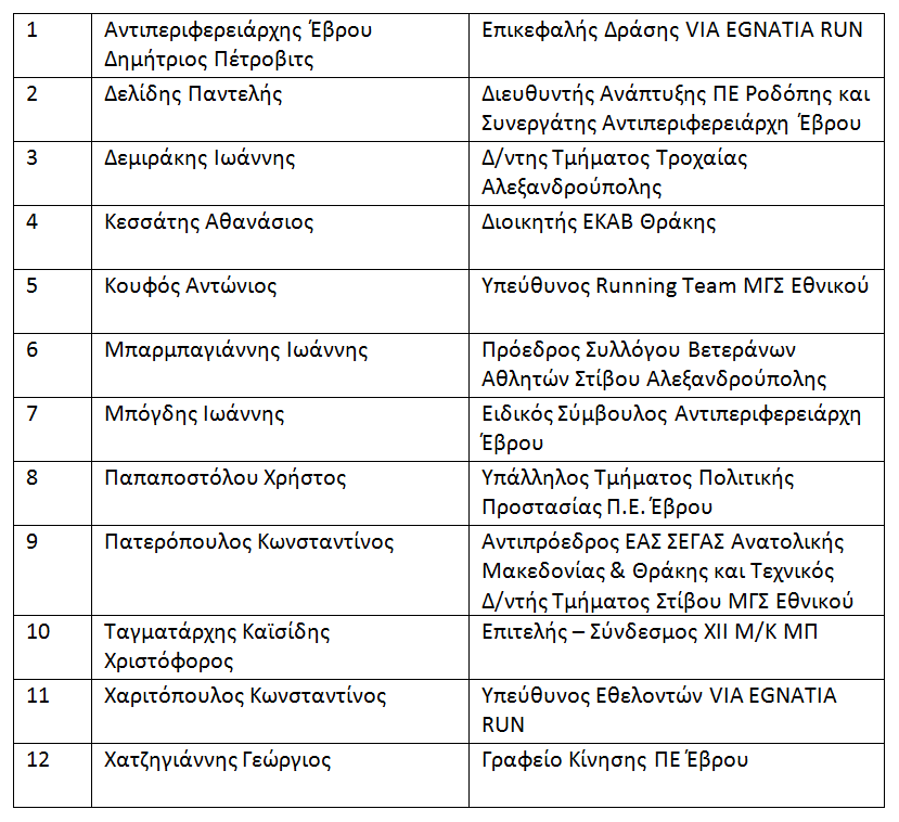 Στο πλαίσιο του «2ου Φεστιβάλ Via Egnatia» η Περιφέρεια Ανατολικής Μακεδονίας και Θράκης – Περιφερειακή Ενότητα Έβρου, διοργανώνει αγώνα δρόμου με την επωνυμία: «VIA EGNATIA RUN». Ο αγώνας αποτελεί σημείο αναφοράς του Φεστιβάλ εκδηλώσεων «Via Egnatia», καθώς αναβιώνει μέσω του αθλητισμού και προσεγγίζει τμήμα της διαδρομής που ένωσε στο παρελθόν την Κωνσταντινούπολη με τη Ρώμη, εμπορικά, οικονομικά, πολιτισμικά. Θα πραγματοποιηθεί την Κυριακή, 4 Σεπτεμβρίου 2016, με ώρα εκκίνησης τις 17:30. Η υλοποίηση της δράσης συντονίζεται από την Οργανωτική Επιτροπή του Αγώνα αποτελούμενη από τους παρακάτω: